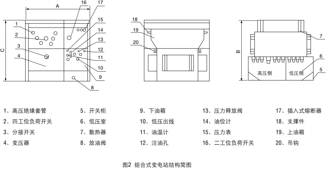 產(chǎn)品結(jié)構(gòu)特點(原理圖見圖1、結(jié)構(gòu)圖見圖2) 變壓器器身與高壓開關(guān)設備分油箱裝配,兩者僅電氣連接而油相互隔離。帶電操作負荷開關(guān)產(chǎn)生的電弧只能使負荷開關(guān)油箱中的油變黑甚碳化而不影響變壓器中油的質(zhì)量。損耗小、過載能力強??捎糜诃h(huán)網(wǎng)供電、雙電源供電或終端供電系統(tǒng)中,供電方式轉(zhuǎn)換方便、運行可靠。 本產(chǎn)品具有缺相保護裝置,當缺相時,可自動同時斷開變壓器的進線負荷開關(guān)和低壓側(cè)斷路器(總開關(guān)),也可只斷開高壓側(cè)負荷開關(guān)或低壓側(cè)斷路器。 |